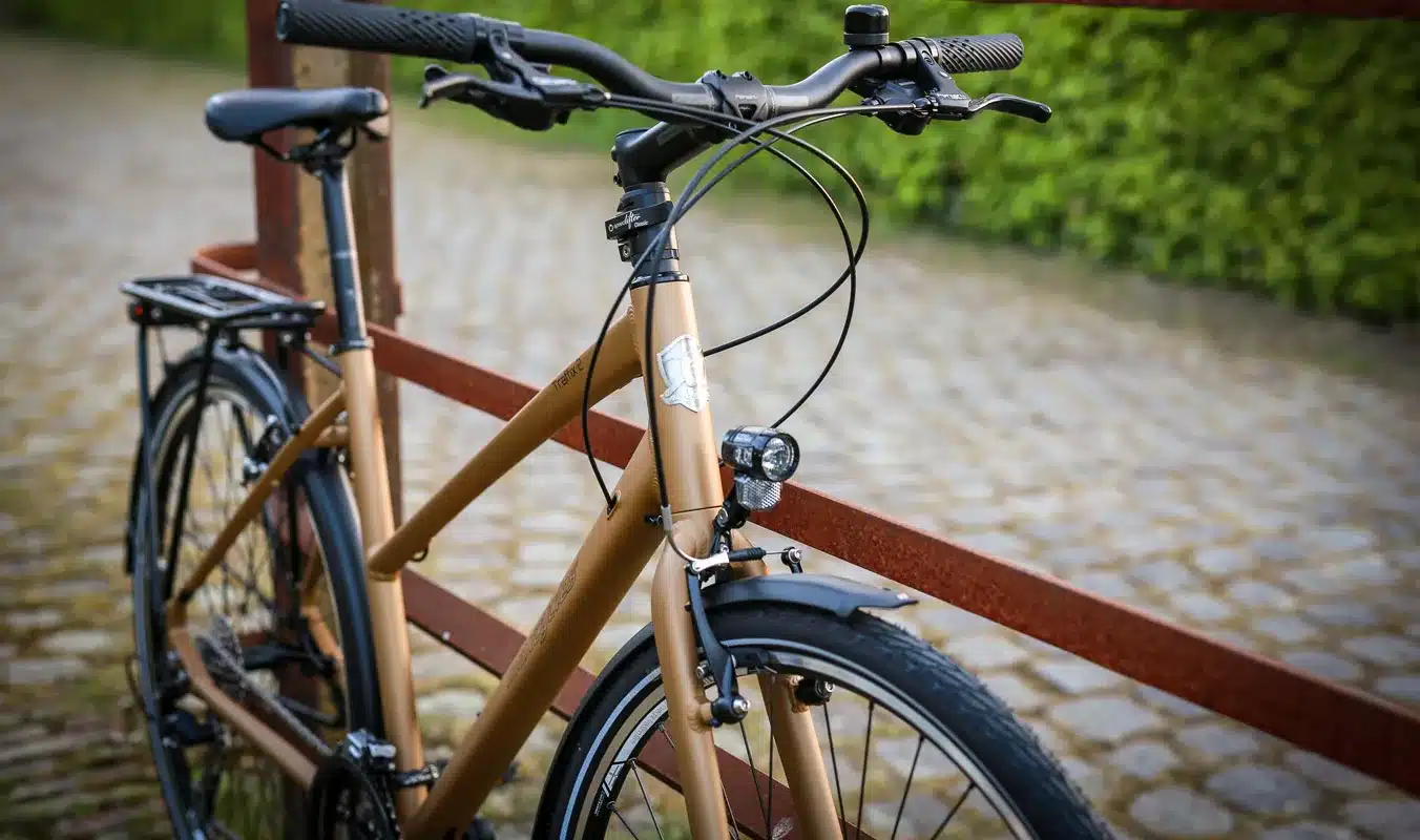 Der Aluminiumrahmen sorgt für das geringe Gewicht und eine lebendige, aber komfortable Fahrt. Die 28-Zoll-Laufräder bieten in der Stadt gute Abrolleigenschaften und Laufruhe. Am Cockpit findet sich die Feinwerk MoonBar mit einem Feinwerk Comfort + Sattel für ergonomische Abstimmung. Das FSA No.8B Steuerlager mit Industrielagern steht für Haltbarkeit, und die Sattelstütze misst 27,2/30,4 mm. Die Gabel ist aus Aluminium mit Stahlschaft.