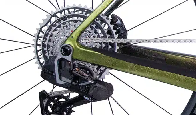 Nahaufnahme des grünen Rahmens mit einem SRAM Force XPLR Schaltwerk, einer Kassette und der Kette eines Fahrrads.