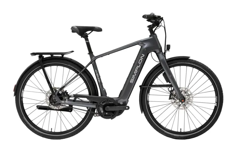 Seitenansicht eines grauen Simplon Chenoa :e High E-Trekkingrads auf weißem Hintergrund.