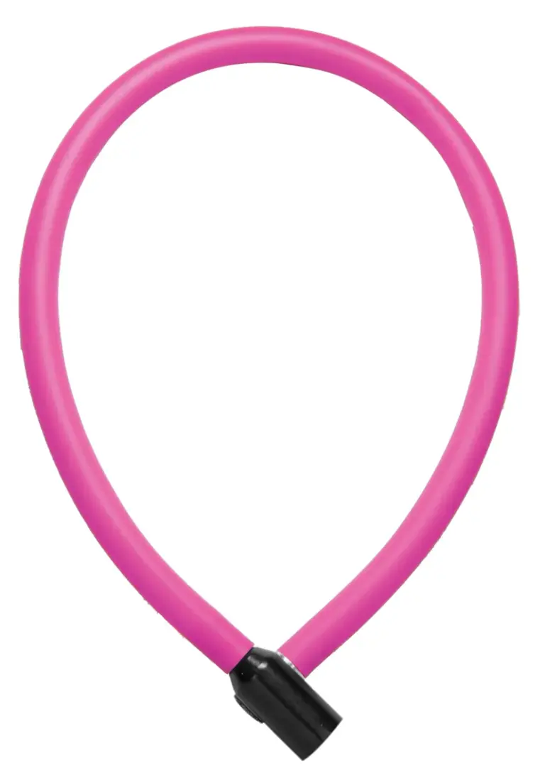 Eine Besonderheit ist die matte Ummantelung des Stahlseils, die optisch und praktisch überzeugt. Verfügbar in verschiedenen Farben – die Hauptvariante ist Pink – schützt sie den Rahmen vor Kratzern, wenn das Schloss um Oberrohr oder Sattelstütze geführt wird. Bei bunten Kinder- und Jugendrädern kann es als farbiges Detail dienen.